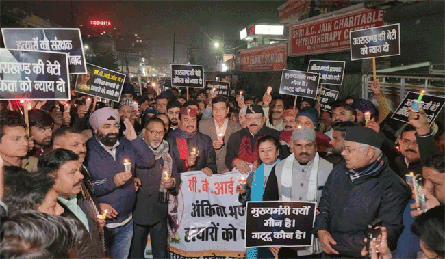 देहरादून में निकाला कैंडल मार्च, न्याय मिलने तक संघर्ष जारी रखने का ऐलानदेहरादून में राजपुर विधानसभा के वार्ड 24 शिवाजी मार्ग कांवली रोड़ से पार्षद पद के प्रत्याशी रहे एवं कांग्रेस के युवा नेता एडवोकेट नीतीन की ओर से अंकिता भंडारी को न्याय दो, के तहत कैंडल मार्च आयोजित किया गया। कैंडल मार्च में उत्तराखंड प्रदेश कांग्रेस की संचालन समिति के अध्यक्ष प्रीतम सिंह, कांग्रेस में प्रबंधन समिति के अध्यक्ष डॉ. हरक सिंह रावत जी ने शिरकत की। (खबर जारी, अगले पैरे में देखिए)