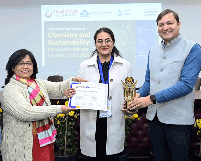देहरादून स्थित ग्राफिक एरा डीम्ड यूनिवर्सिटी में सतत् विकास लक्ष्यों में रसायन विज्ञान की भूमिका पर दो दिवसीय अंतर्राष्ट्रीय सम्मेलन के समापन समारोह का आयोजन किया गया। इसमें विशेषज्ञों ने विभिन्न रासायनिक प्रक्रियाओं, पर्यावरण संरक्षण, नवीन पदार्थों के विकास और सतत् तकनीकी नवाचारों पर विचार-विमर्श किया। (खबर जारी, अगले पैरे में देखिए)