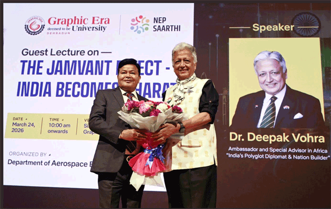 राजनयिक रहे डा. दीपक वोहरा ने कहा कि आज भारत की सबसे बड़ी ताकत उसका मानव संसाधन है, जो अपार संभावनाओं, अटूट आत्मविश्वास और दृढ़ संकल्प से भरा हुआ है। वह देहरादून स्थित ग्राफिक एरा डीम्ड यूनिवर्सिटी के सिल्वर जुबली कन्वेंशन सेंटर में जामवंत इफेक्ट विषय पर एक विशेष कार्यक्रम को संबोधित कर रहे थे। डा. वोहरा ने भारत की वैश्विक पहचान, सांस्कृतिक मूल्यों और आत्मनिर्भरता की दिशा में बढ़ते कदमों पर प्रकाश डाला। (खबर जारी, अगले पैरे में देखिए)