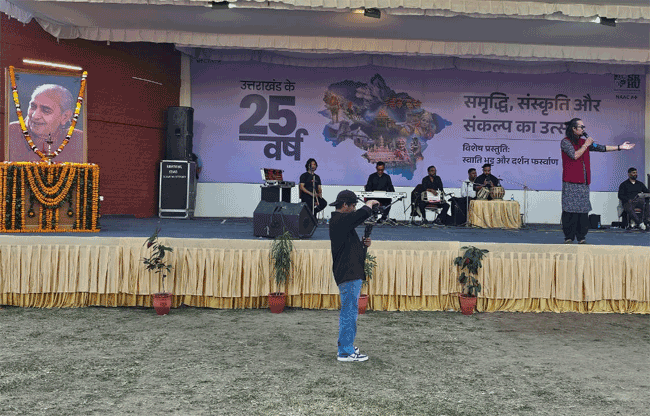 कार्यक्रम की अगली कड़ी में दोपहर बाद उत्तराखंड के प्रसिद्ध लोकगायक दर्शन फर्स्वाण और स्वाति भट्ट द्वारा सांस्कृतिक प्रस्तुतियां दी गईं। उनके प्रस्तुत किए गए लोकगीतों और झोड़े-छपेली की मनमोहक धुनों पर छात्र-छात्राएं झूम उठे। विश्वविद्यालय परिसर में उत्तराखंडी संस्कृति की झलक ने सभी को भावविभोर कर दिया।