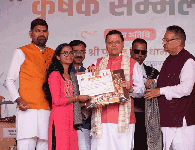 मुख्यमंत्री पुष्कर सिंह धामी ने शुक्रवार को राज्य के रजत जयंती उत्सव के अवसर पर पंतनगर कृषि एवं प्रौद्योगिकी विश्वविद्यालय में वृहद कृषक सम्मेलन का शुभारम्भ किया। कार्यक्रम में कृषि, उद्यान, दुग्ध, मत्स्य, सहकारिता के प्रगतिशील कृषक व लखपति दीदीयों को मुख्यमंत्री द्वारा प्रतीक चिह्न, प्रशस्ति पत्र व अंगवस्त्र भेटकर सम्मानित किया गया। (खबर जारी, अगले पैरे में देखिए)